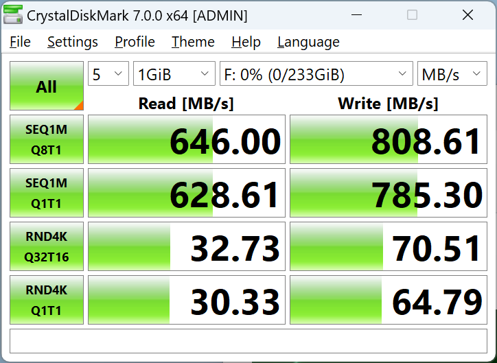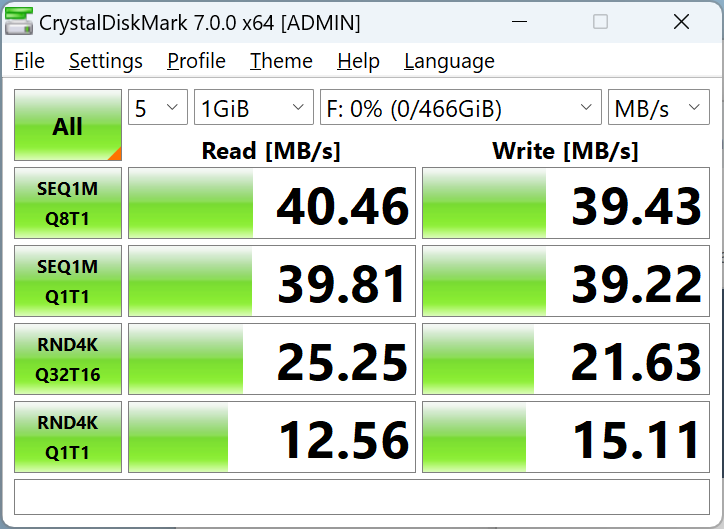 Next, I plugged the Rosonway hub into the exact same port the USB stick was connected to, plugged the USB stick into the new USB 3.1 hub and ran the same test again. As you can see, the results were close enough to consider “basically the same”: